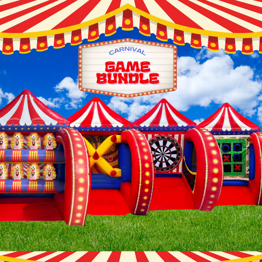 Step right up and enjoy four times the fun with our 4-Pack Inflatable Carnival Games — a bundle deal that saves you money when you reserve all four games together! This set includes crowd favorites like Foam Darts, Tic Tac Toe, Ring Toss, and Down-A-Clown — all connected in one giant inflatable setup.
